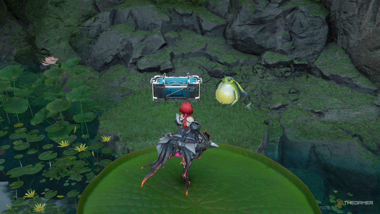 Take the leaf moving in the water on the east side above your chest. I can solve the frog puzzle To get this box. |