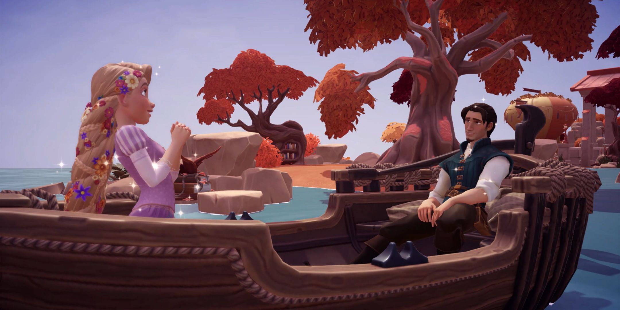 Once you've built the dinghy, you can wait until sunset to place it somewhere in Storybook Vale, or you can deploy it immediately. A short cutscene will play showing Rapunzel and Flynn having a romantic moment. Next, go to the couple and listen to their conversation to complete the quest A Romantic Reunion.