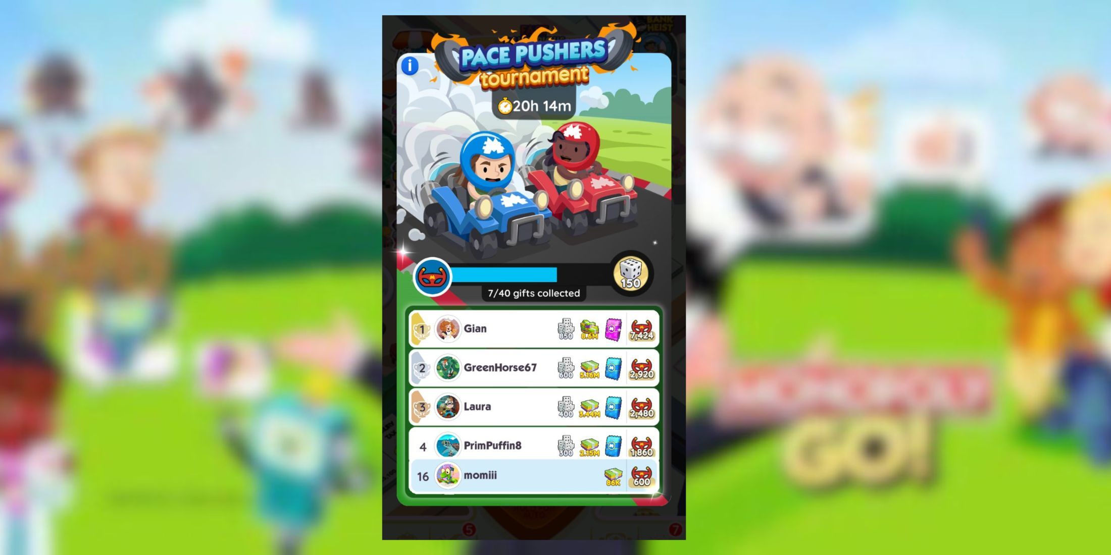 PACE PUSHERS Tournament monopoly has rewards and milestones.
