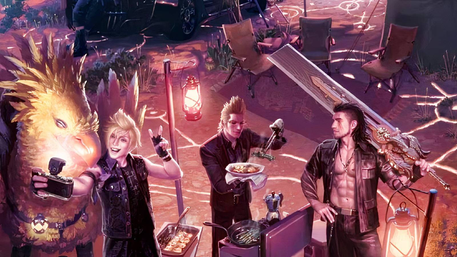 “Camp comrades” Magic: The Gathering The scene box includes six exclusive cards, six art-only cards, and three 14-card play booster packs. final fantasy Card and display easel. The scene depicted across six cards shows the game's four main characters relaxing in camp. Noctis poses with his Regalia car, Ignis cooks a meal, Gladiolus shows off his sword, and Prompto takes a selfie with a chocobo. What suddenly becomes very valuable is the latter of the four, a blue magic card called “Flash Photography.”
