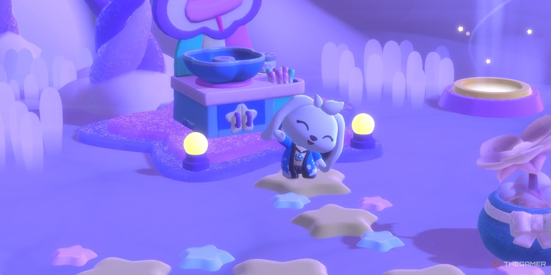 A player standing on the candy cloud machine of Hello Kitty Island Adventure.