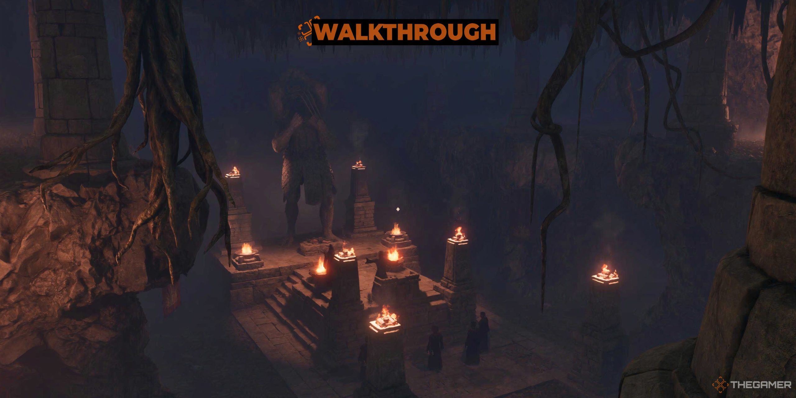 When you enter the cave through the double wooden door The mythical dawn doorkeeper greets When you go deep into the cave and head to the entrance of the Dagon Shrine.