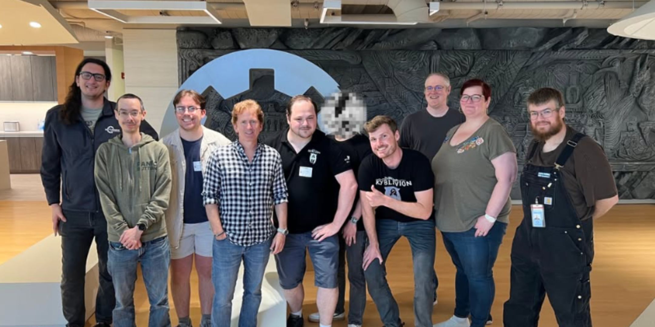 In the first image, tod Howard himself had time to talk with those who made SkyBlivion. We also see that the crew gets some snaps with the products around the Bethesda building and talks in one of the conference rooms.
